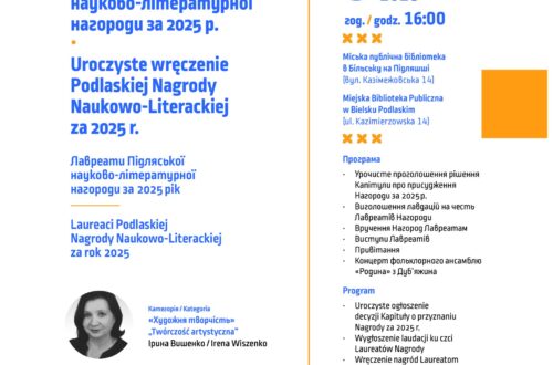 На каналі YouTube Союзу українців Підляшшя є доступна нова інтернетна передача українською мовою «Українське слово». В прорамі побуваємо на майстер-класах гурту “Гілочка” з Черемхи, які відбулися у липні та серпні в Вільці Надбужної. Запрошуємо слухати! Завдання «Інтернетні передачі українською мовою «Українське слово»» реалізує Союз українців Підляшшя завдяки дотації Міністра внутрішніх справ та адміністрації. Український часопис Підляшшя «Над Бугом і Нарвою» є партнером у реалізації цього завдання.
