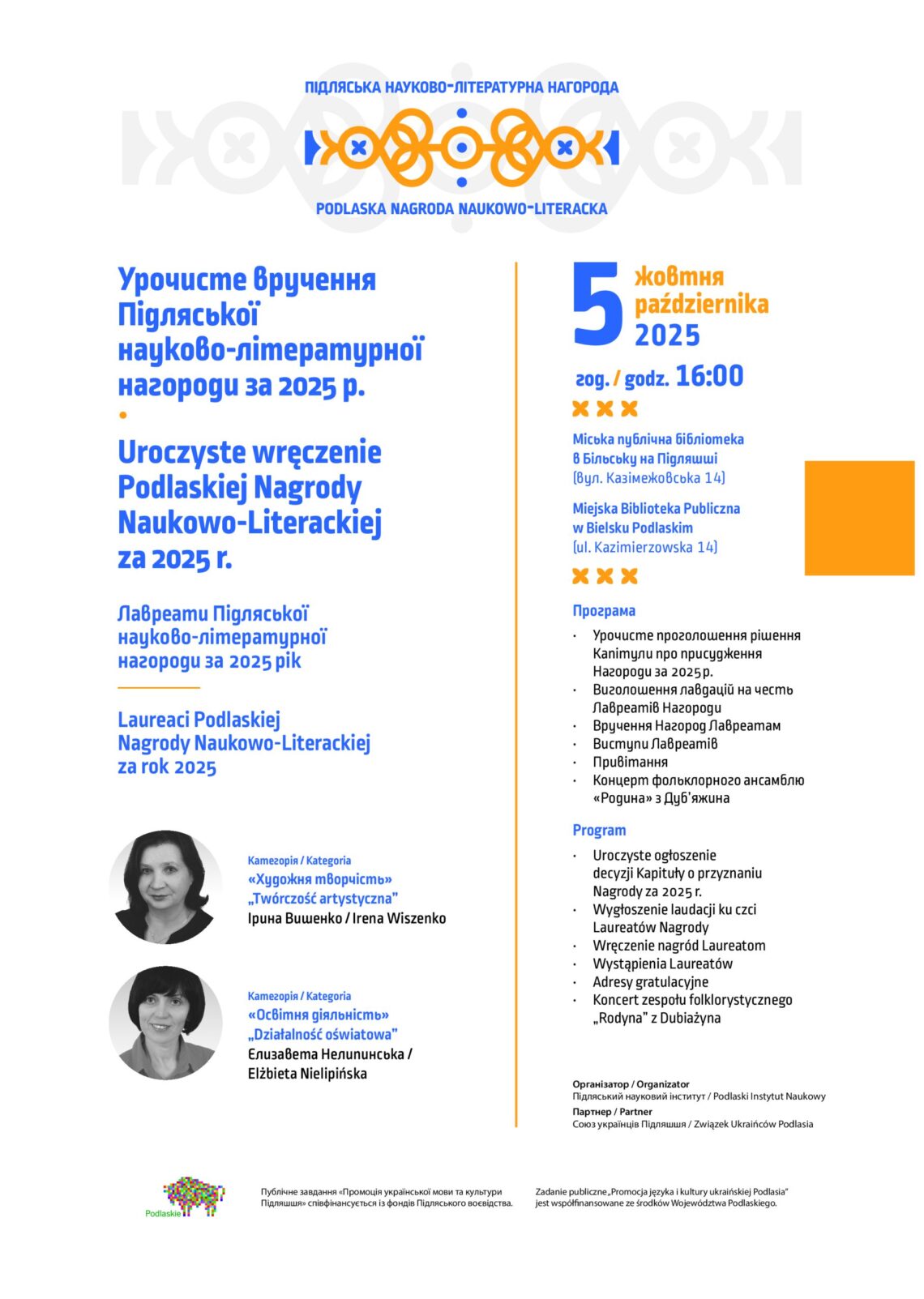 Урочисте вручення Підляської науково-літературної нагороди за 2025 рік відбудеться в неділю 5 жовтня 2025 р. о 16 год. в Міській публічній бібліотеці в Більську на Підляшші (вул. Казімежовська 14). У програмі урочистості:● Урочисте проголошення рішення Капітули про присудження Нагороди за 2025 р.● Виголошення лавдацій на честь Лавреатів Нагороди● Вручення Нагород Лавреатам● Виступи Лавреатів● Привітання та виступи офіційних гостей● Концерт фольклорного ансамблю «Родина» з Дуб’яжина Запрошуємо! Подія у Фейсбуці:https://www.facebook.com/events/819693627182374 Лавреатками Підляської науково-літературної нагороди за 2025 рік стали:Категорія « Художня творчість» – Ірина Вишенко,Категорія «Освітня діяльність» – Єлизавета Нелипинська. Ірина Вишенко – засновниця та багаторічна керівник Українського ансамблю пісні і танцю «Гілочка» в Черемсі, вчителька української мови, аніматорка українського культурного життя в регіоні.…